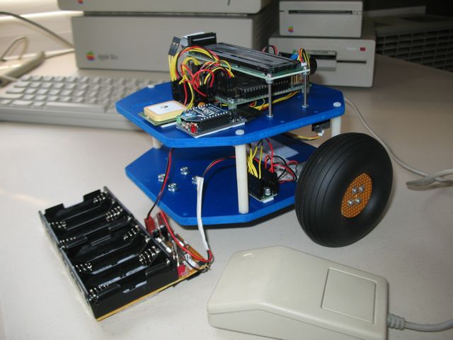 Lots of work is going into the software, and the robot has broken the surly bonds of my bench supply. Here are a few new pictures with an Apple IIgs shown for scale.
