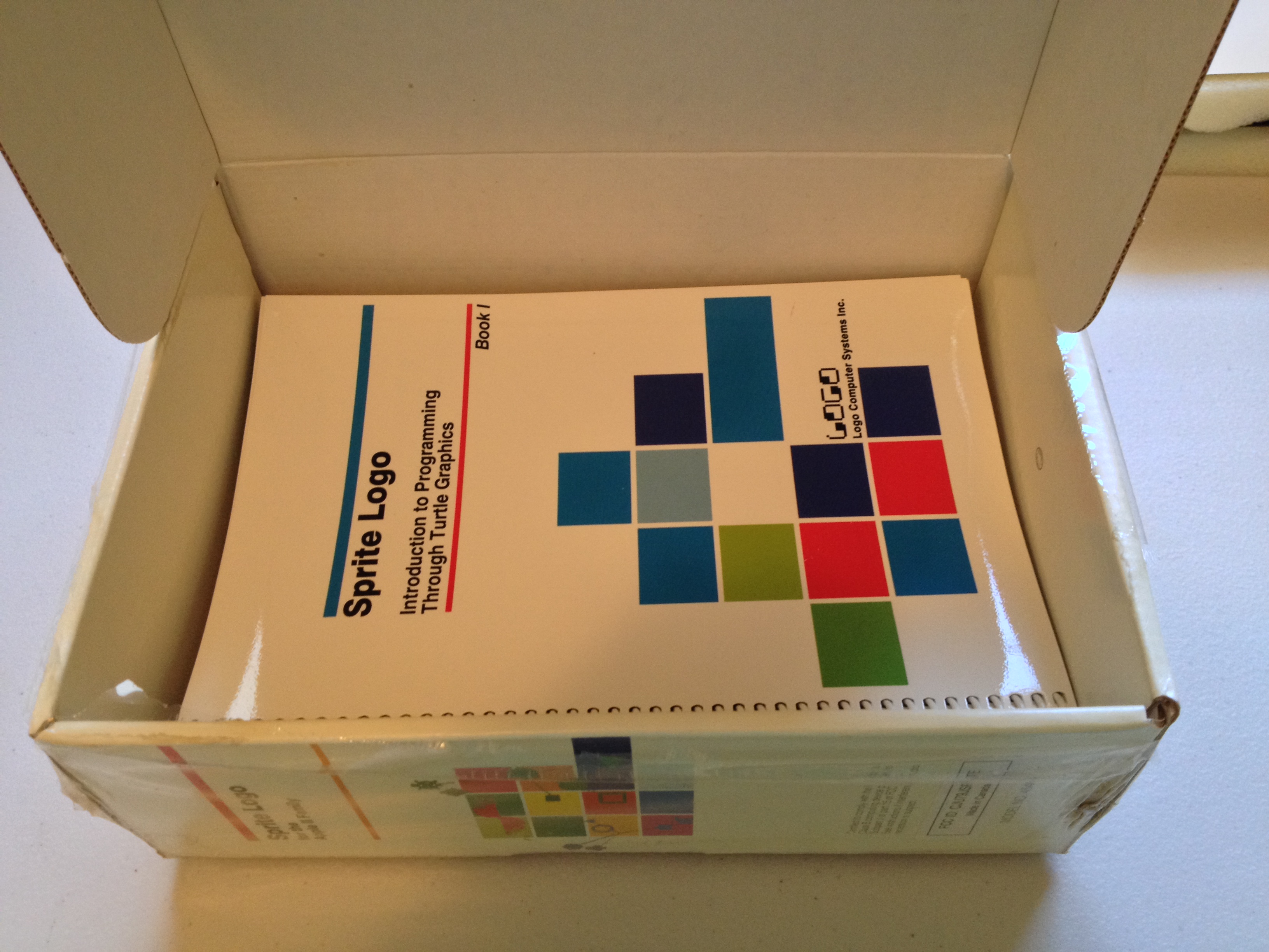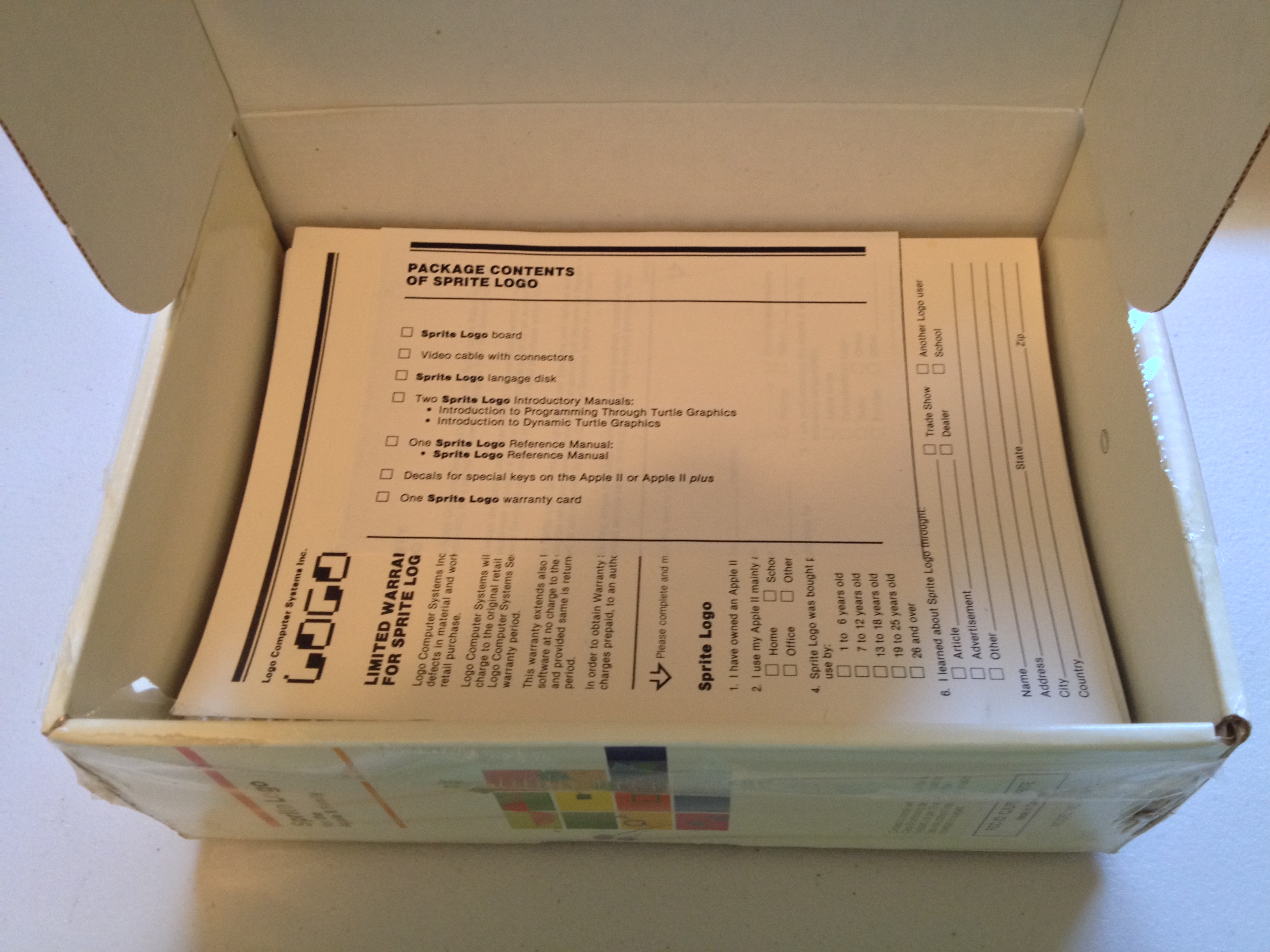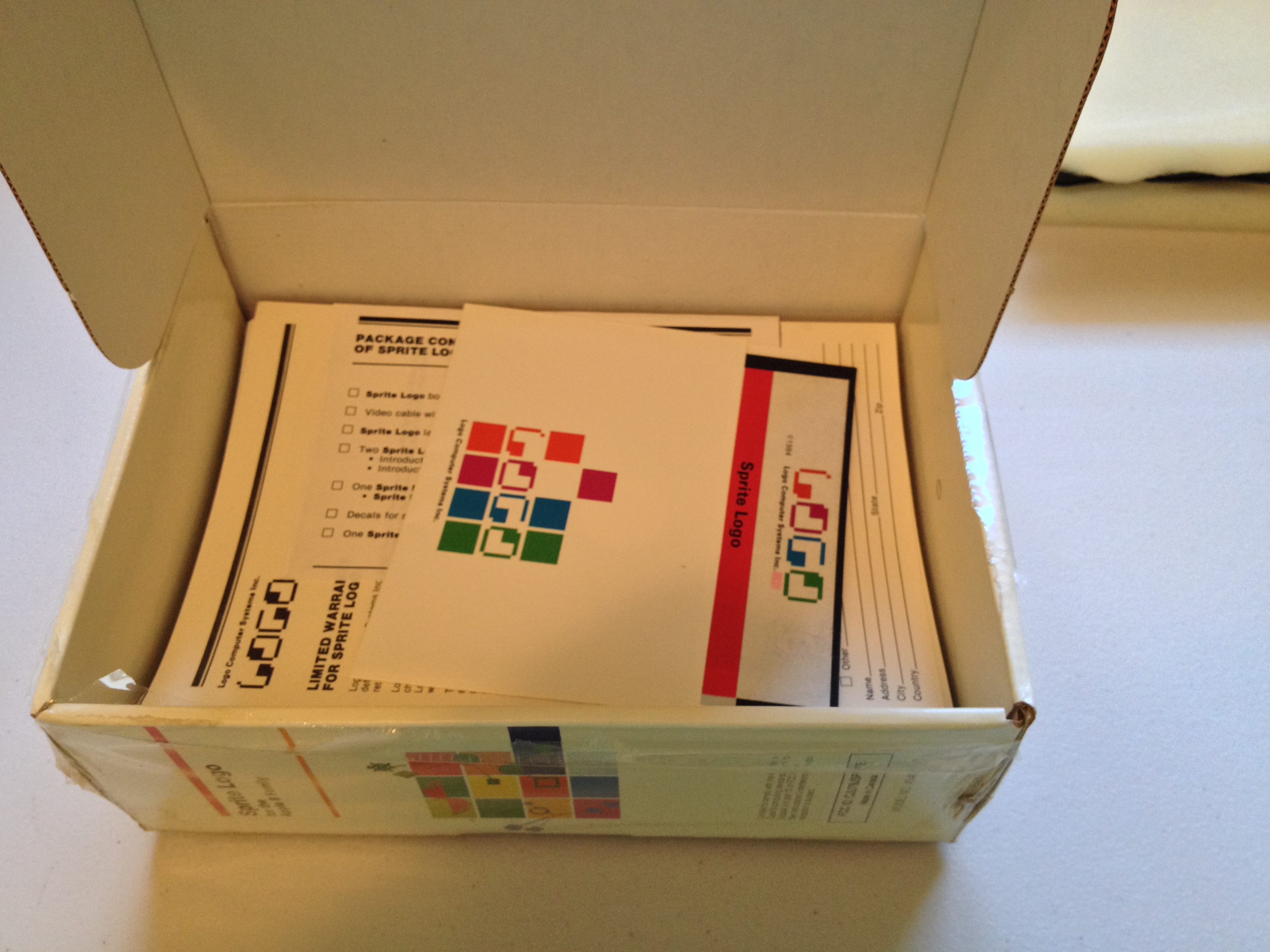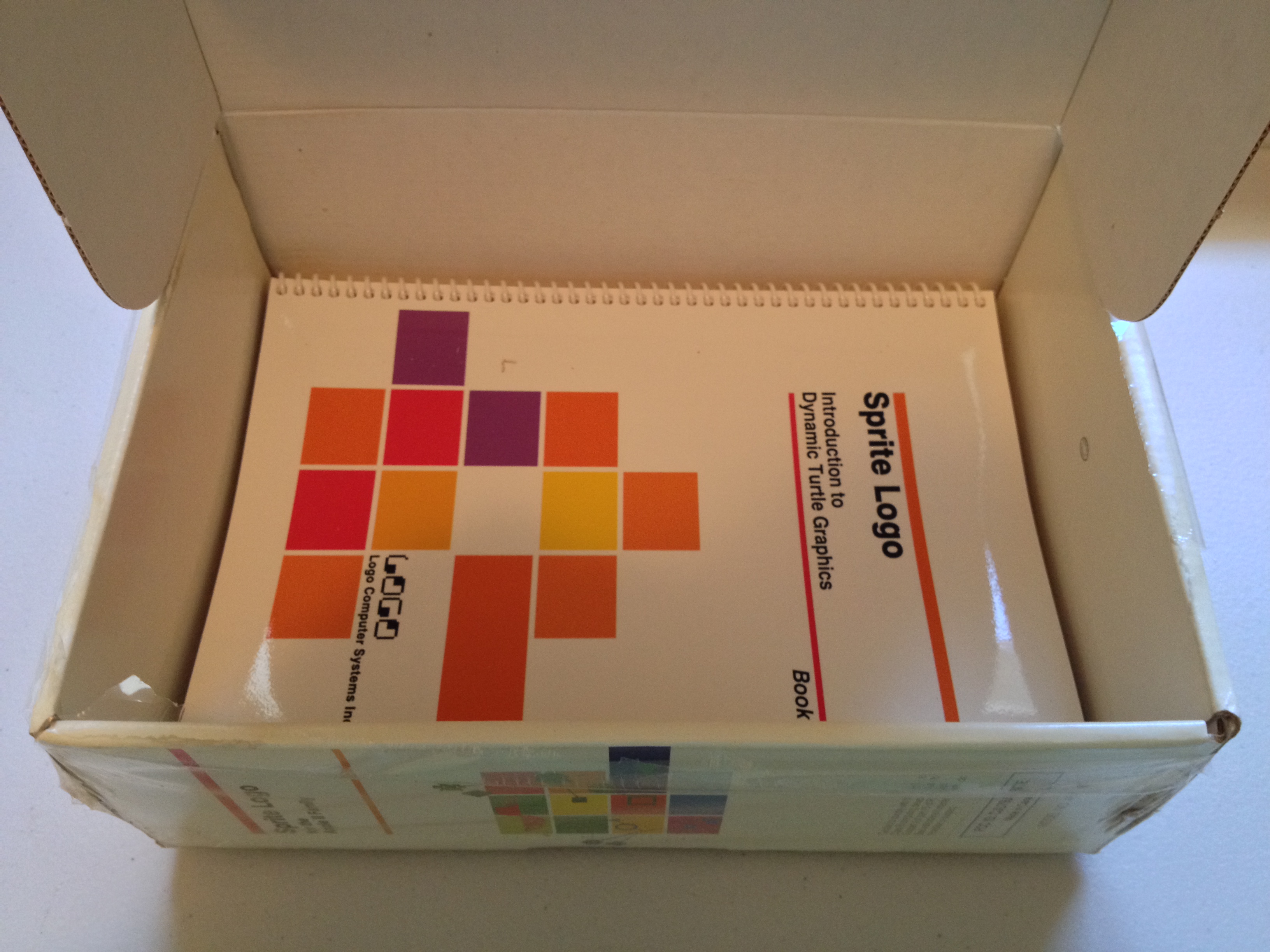 Continuing my exploration of LCSI’s “Sprite Logo”, let’s break the shrink wrap and open the box. These photographs preserve the original packing order. Despite dirt and water damage to the exterior, the box contents appear pristine.
