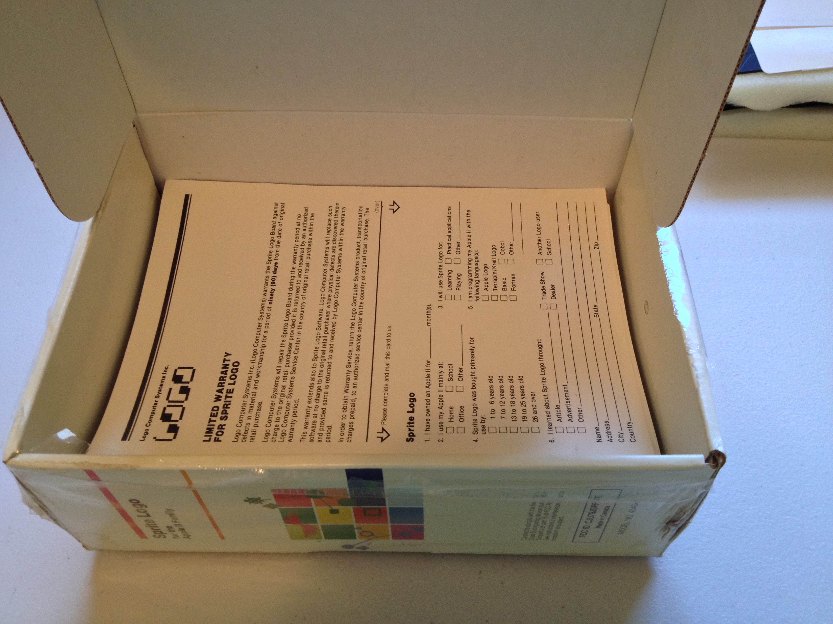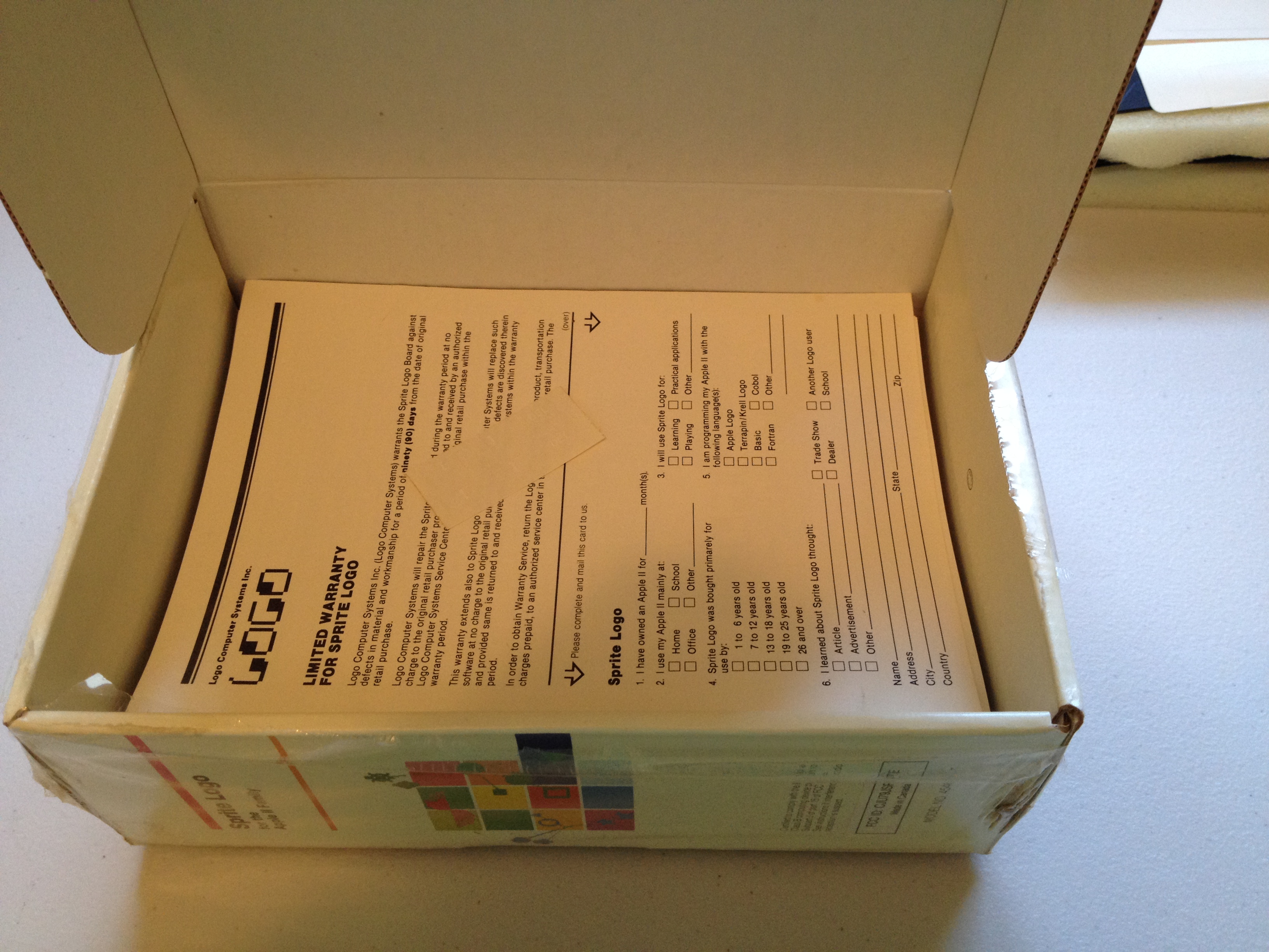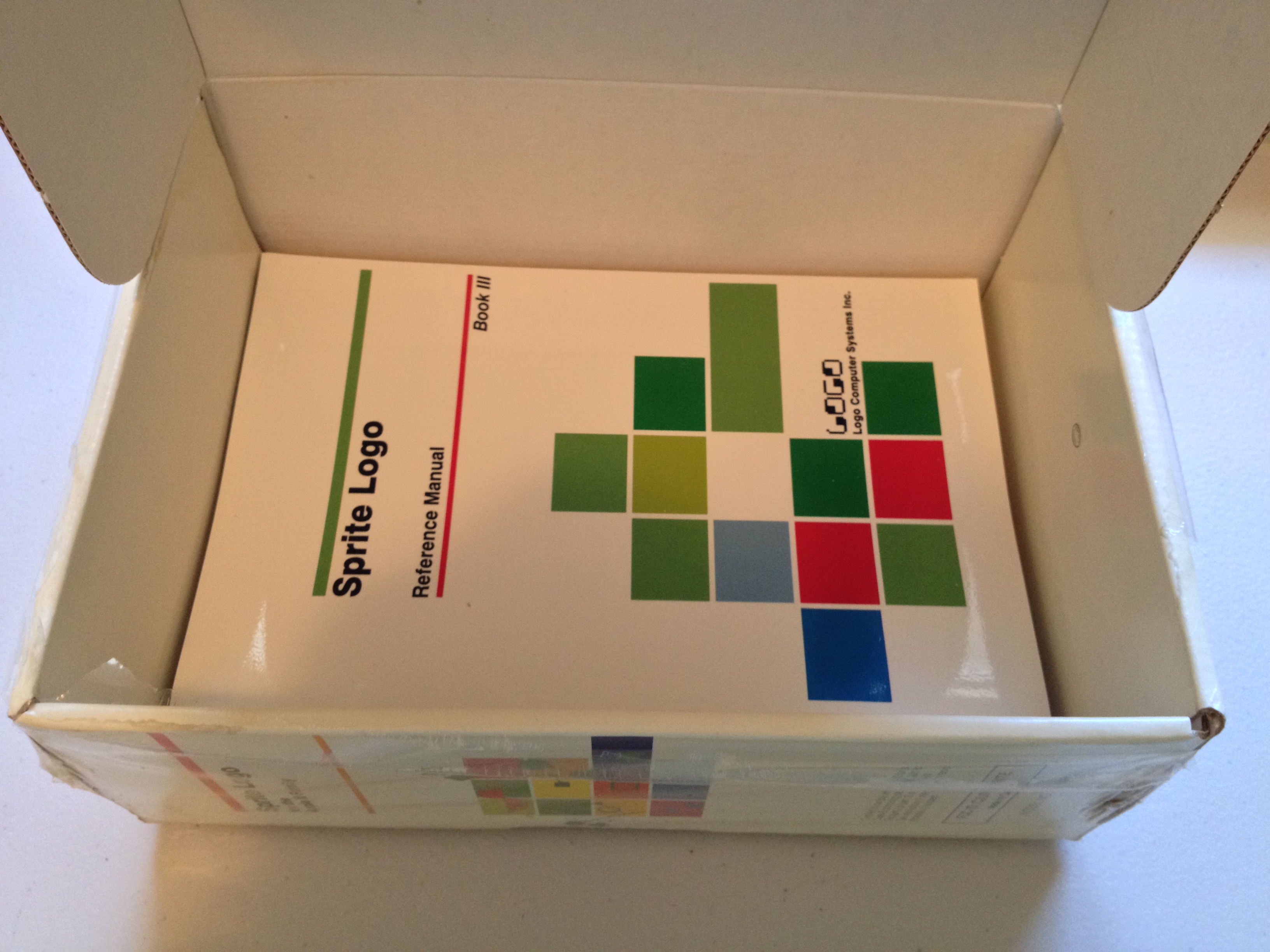 Continuing my exploration of LCSI’s “Sprite Logo”, let’s break the shrink wrap and open the box. These photographs preserve the original packing order. Despite dirt and water damage to the exterior, the box contents appear pristine.